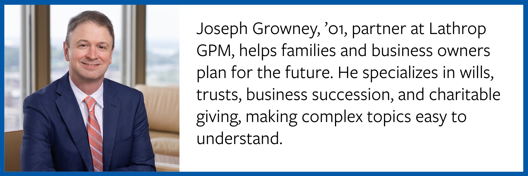 Joe Growney, ’01 Rockhurst University Alum and Partner with Lathrop GPM will present and share his insight and experience on Planned Giving and Achieving Your Giving Goals.
